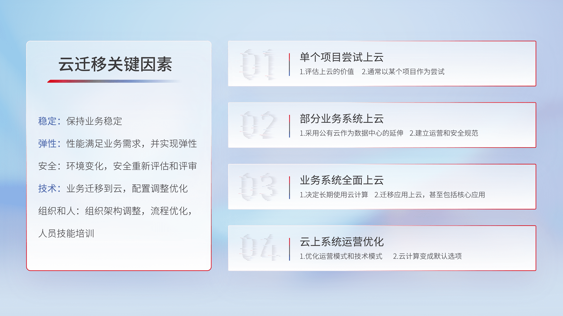 结合实际业务,,,从规划设计、、云平台选型、、、云原生改造、、数据迁移、、、集成交付,,,迁移全过程为客户识别最佳上云路径,,做好风险识别管理,,,,设计网络架构、、、身份权限、、安全审计合规、、操作审计、、、、日志审计、、监控告警策略、、、、多站点容灾设计等,,对云上基础设施进行整体规划,,,提升IT治理水平,,,,以满足弹性、、高可用、、、高性能的需求。。。。