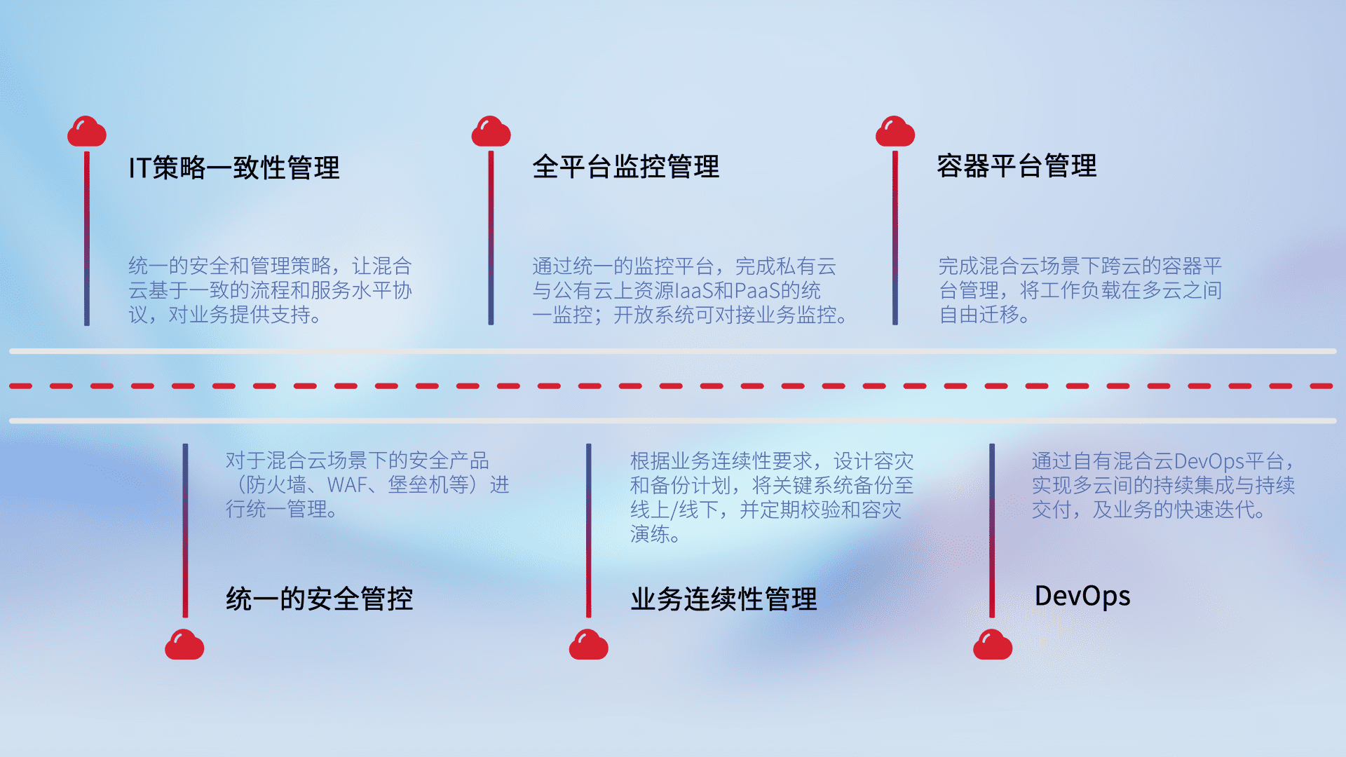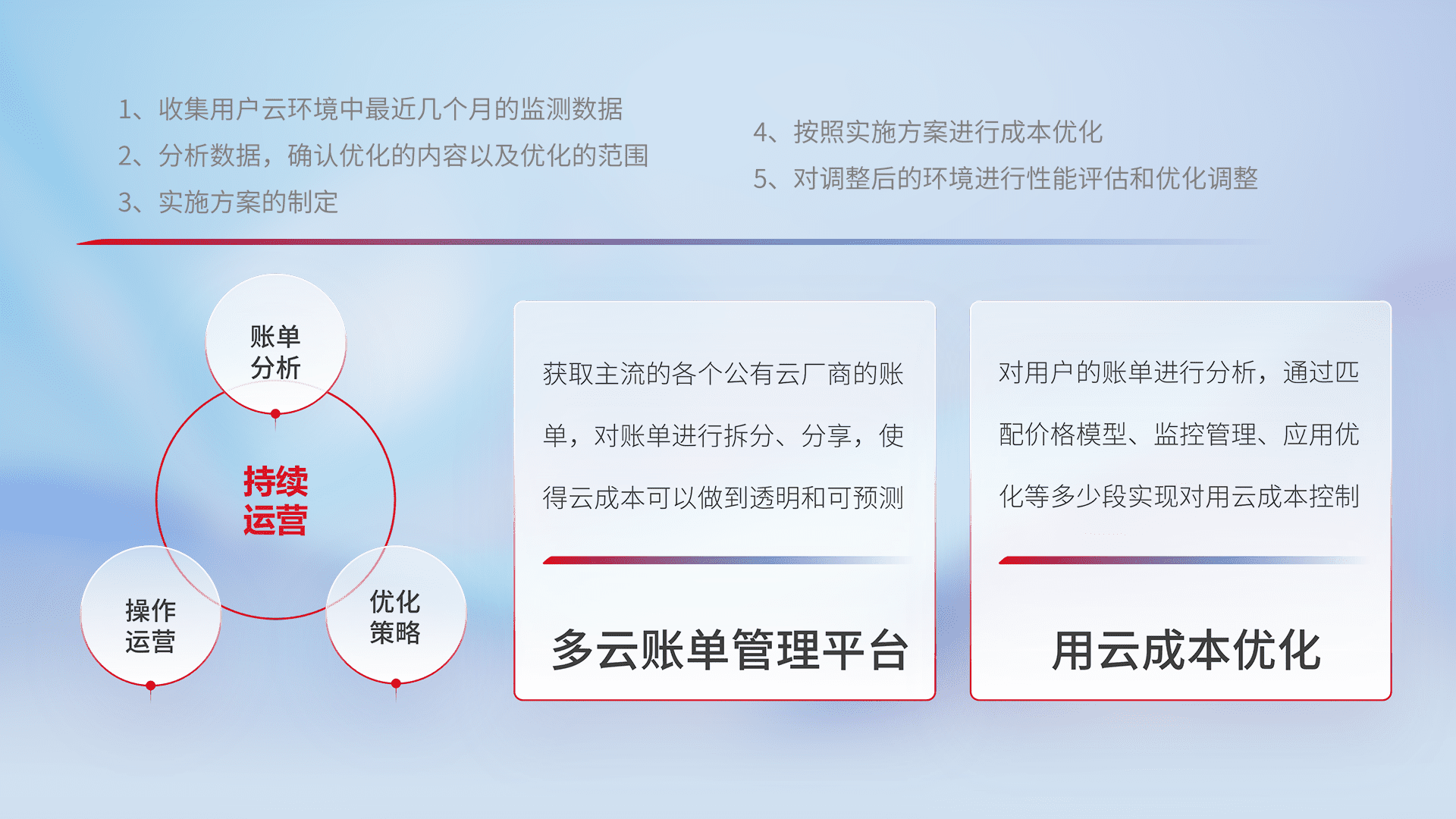通过多云纳管,,,,以统一的资源数据模型把客户的云资源进行抽象和封装,,,进而实现对多云资源的统一操作,,,,保障云资源管理的可靠性、、、稳定性与可用性。。。量身定制化运维内容,,配置、、、、开发运维、、补丁管理、、、备份、、、、监控、、认证和访问管理、、、、审计和日常巡检等,,,保障在用云过程中的可靠度,,,稳定度以及高可用率。。。