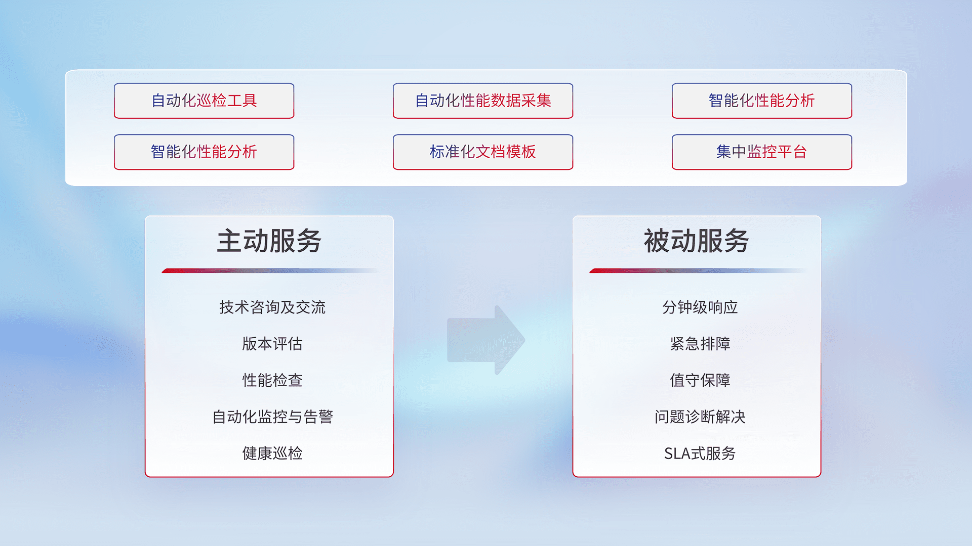 智能化工具和标准化文档,,,保障服务质量,,,提供主动服务(包含技术咨询、、、、版本评估、、、、性能检查、、自动化监控与告警、、健康巡检)和被动服务包含(分钟级响应、、、紧急排障、、、、值守保障、、问题诊断解决、、、SLA服务)。。。。