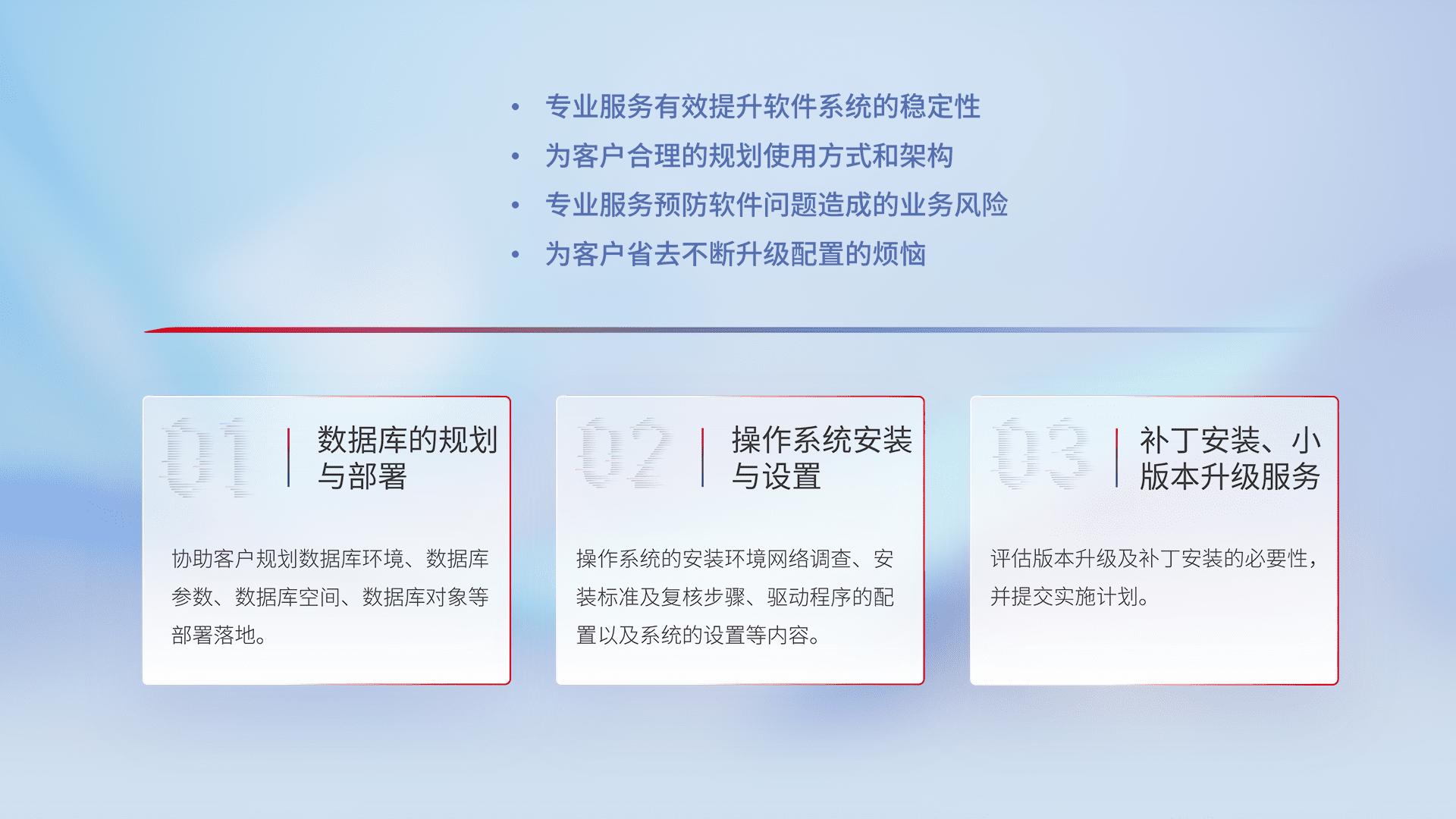 为客户提供软件规模升级、、、快速部署、、、按需配置的专业服务,,从数据库的规划与部署到操作系统的安装与设置,,,,再到补丁安装和小版本升级提供支持。。。