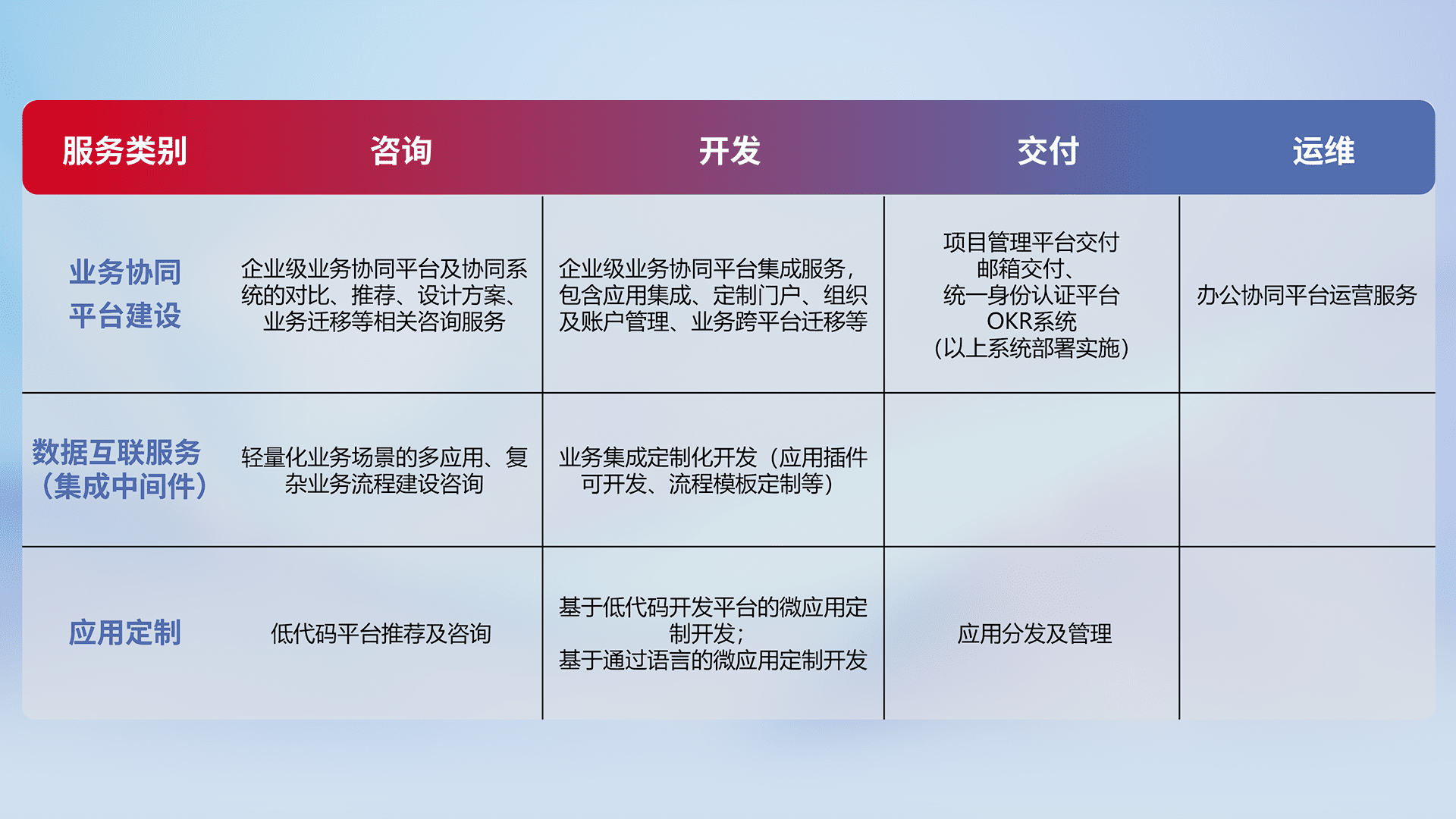 针对钉钉、、、、企微、、、、IDaas等平台级产品提供产品的规划、、、、方案、、、交付、、、、定制化开发等服务,,,实现如统一协同办公、、智能客户服务、、、、混合会议管理、、、、智能数据查询、、等业务场景,,实现数字化转型。。。。